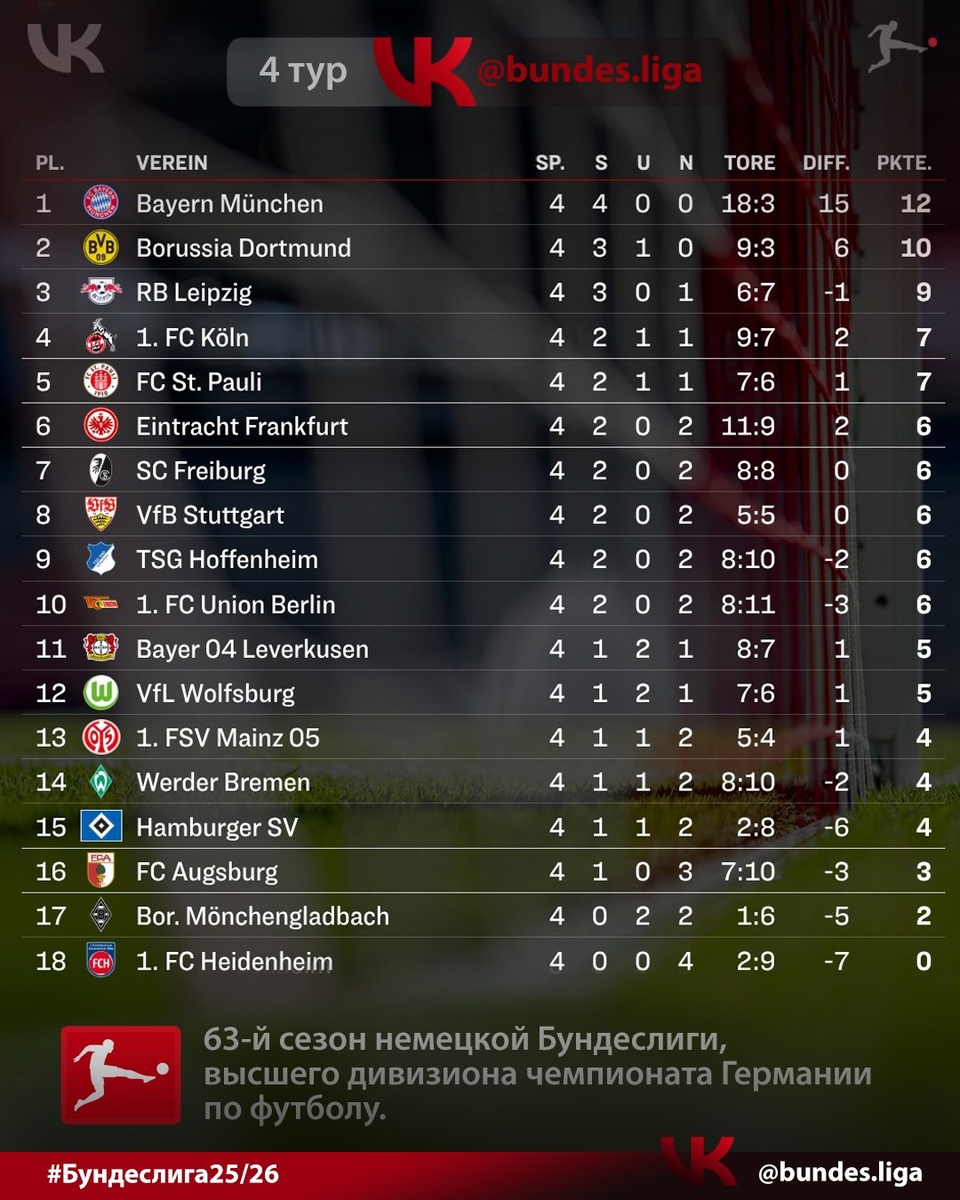 #Бундеслига 📝 Таблица после 4-х туров сезона 25/26 🇩🇪 Больше статистики и новостей в нашем ТГ ⚽ https://dzen.ru/id/6054fd15e468d146f37d5335