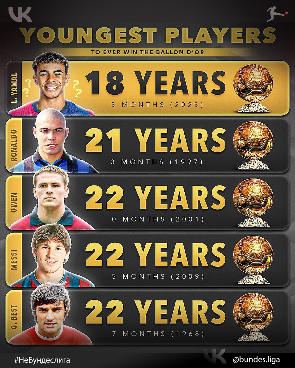 Если сегодня #ЗолотойМяч возьмёт Ламин Ямаль, то он станет самым молодым обладателем престижной награды за всю историю