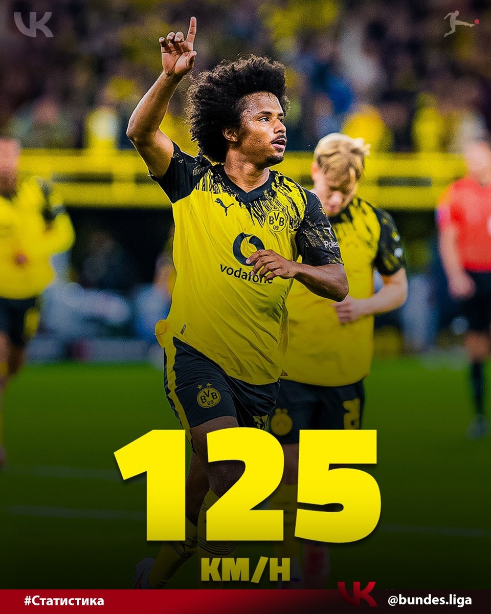 🔥 Гол Адейеми принёс «Боруссии» Дортмунд победу над «Вольфсбургом». Отдельно нужно отметить скорость удара Карима 💥 Футболист нанес неотразимый удар левой ногой с расстояния 24,5 м. Мяч влетел в угол со скоростью 125 км/ч (*ошибка 1265 км/ч 😅) - это один из самых быстрых ударов в сезоне.