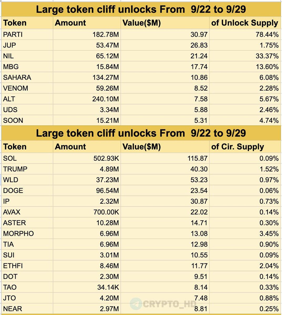 #анлок 🔓 ТОП разблокировок токенов с 22 по 29 сентября! Cliff Unlocks: ▫️#PARTI – $30,97m ▫️#JUP – $26,83m ▫️#NIL – $21,24m ▫️#MBG – $17,74m ▫️#SAHARA – $10,86m ▫️#VENOM – $8,52m ▫️#ALT – $7,58m ▫️#UDS – $5,88m ▫️#SOON – $5,31m Linear Unlocks: ▫️#SOL – $115,87m ▫️#TRUMP – $40,30m ▫️#WLD – $53,23m ▫️#DOGE – $23,54m ▫️#IP – $30,87m ▫️#AVAX – $22,02m ▫️#ASTER – $14,71m ▫️#MORPHO – $13,08m ▫️#TIA – $12,98m ▫️#SUI – $10,55m ▫️#ETHFI – $11,77m ▫️#DOT – $9,51m ▫️#TAO – $8,14m ▫️#JTO – $7,48m ▫️#NEAR – $8,81m P.S. Cliff Unlocks – разблокировка крупной порции токенов единовременно в конкретную дату. Linear Unlocks – постепенная разблокировка токенов в течение определенного периода (обычно каждый день или каждую неделю по части). Crypto Headlines