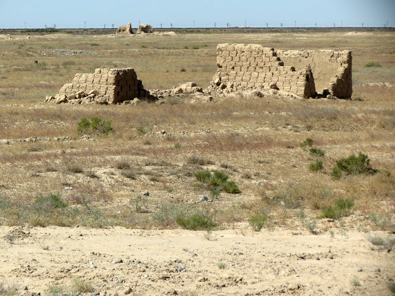 В степи множество глинобитных руин, словно выросших из этой глины. Между трассой и городищем проходит железная дорога: