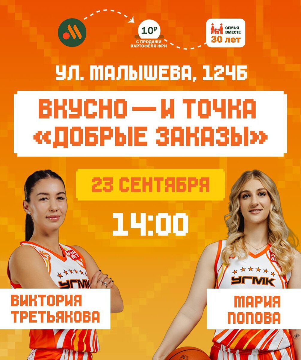 🍟Добрая картошка от БК УГМК и «Вкусно — и точка»! 🍟 Новость на ночь глядя 🙈 Баскетбольный клуб УГМК и «Вкусно — и точка» объединились, чтобы сделать доброе дело! ✨Что такое «Добрая картошка»? ✨ В рамках акции «Добрые заказы» Виктория Третьякова, Мария Попова и Лис Иван будут выдавать заказы с картофелем фри во «Вкусно — и точка»! 🦊 Важно: Часть денег с каждого заказа отправится в благотворительный фонд «Семья вместе»! ❤️ Когда и где: 🗓️ 23 сентября ⏰ Старт в 14:00 📍 «Вкусно — и точка», ул. Малышева, 124Б Приходите поддержать акцию, насладиться вкусной картошкой и сделать по-настоящему доброе дело! 🙏