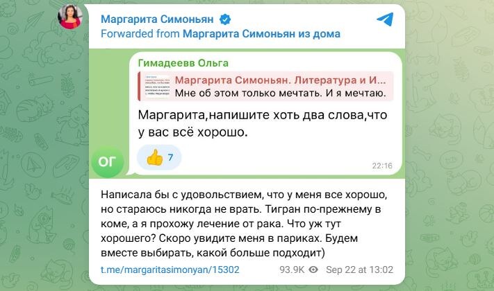 Я желаю Маргарите Симоньян сил, терпения и мужества. Она молодая женщина, у неё трое детей и муж, который нуждается в ней. Она справится. Потому что она сильная. И потому что у неё есть любовь, которая, как мы видим, оказалась сильнее всех болезней и всех невзгод.