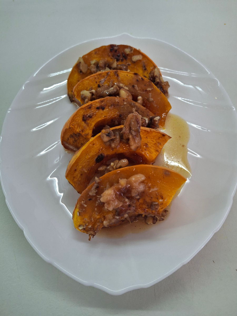 Состав: 700-800 гр. тыквы; 150-200 гр. мёда; 60 гр. орехов грецких; 0,5 ч.л. корицы молотой. Приготовление: Тыкву хорошо моем щёткой. Так как не будем чистить. Моя тыква весила 1400 гр. Я взяла половину. Тыкву разрезаем на пополам, очищаем от семян и режем на дольки. Укладываем в форму для запекания. Поливаем мёдом. (У меня баночка 400гр., я использовала половину, хотелось послаще..) Посыпаем корицей и крупно нарезанными орехами. Ставим в разогретую до 190 градусов духовку на 40-50 минут. Достаём, раскладываем по тарелкам. Поливаем соком. Корочка тоже стала мягкой. Готово. Приятного аппетита!!!