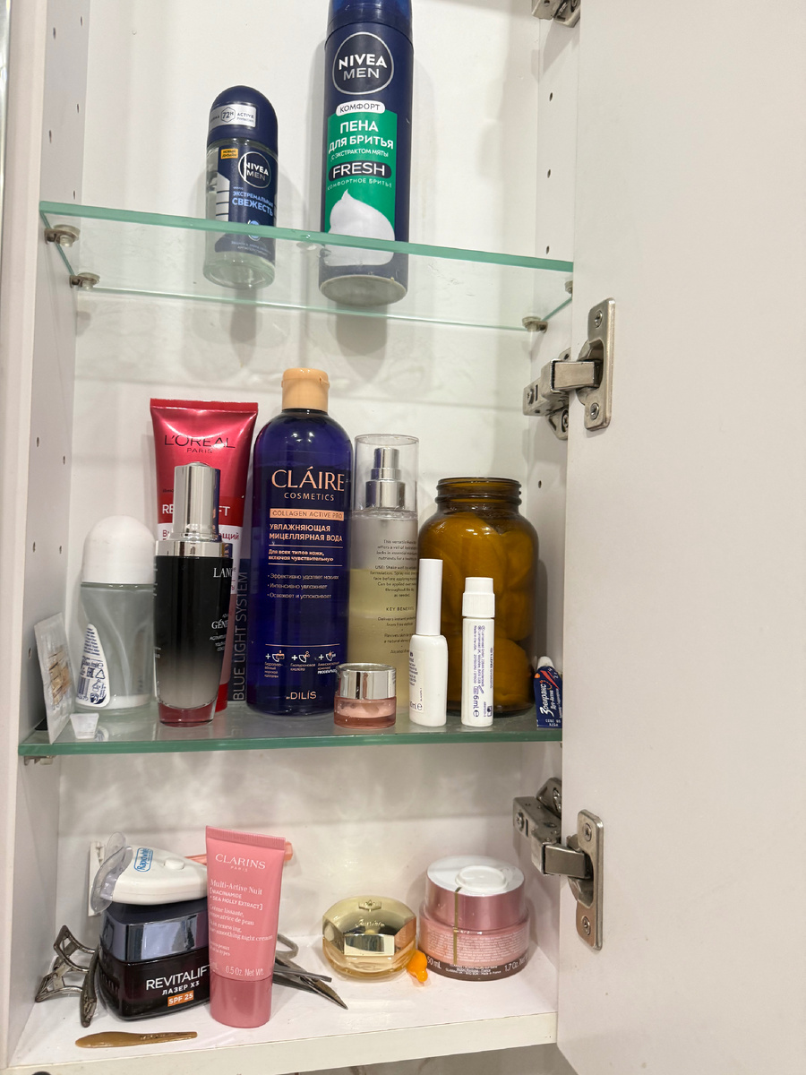 У меня в квартире 2 санузла: совмещенный с ванной, раковиной и унитазом и гостевой, которой помимо своего прямого назначения выполняет функции постирочной и кладовки. Рассказ будет о первом. Именно в нем я делала ремонт 2 года назад: Раз в квартал я делаю его генеральную уборку с мыть ем шкафчиков, Пола под ванной и чисткой известкового налета Содержимое шкафчиков заметно поредело, стоят полупустые. В шкафу под раковиной храню полотенца, комплект принадлежности для окраски волос, фен, плойку, утюжок и дорожную косметичку Младший студент вымыл плитку на стенах и ванную. Я лимонной кислотой убрала известковый налет Как не вытирай капли воды, он все равно образуется. Параллельно расхламила старые мочалки и флаконы, про них отдельно напишу в ежемесячном отчете. Собственно и генеральная уборка затягивалась из-за того, что я хотела их до использовать и освободить шкафчик. И даже нашла кое-что на продажу))) Сфотографировала и выложу на днях. В планах купить новый коврик, старый уехал к ста