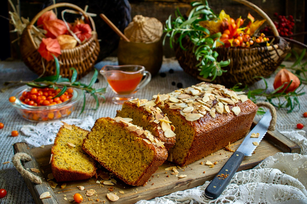 Ингредиенты: ▫️манная крупа — 200 г ▫️сахарный песок — 200 г ▫️яйца куриные крупные — 3 шт. ▫️пшеничная мука — 35 г ▫️сливочное масло — 65 г ▫️облепиха — 150 г ▫️кефир 3,2% — 200 мл ▫️мак — 40 г ▫️сода — 4 г ▫️разрыхлитель — 7 г ▫️миндальные лепестки — 20 г ▫️джем — 15 г ▫️соль — по вкусу Способ приготовления: 1. Смазываем форму (в этом рецепте размер - 22х12 см) размягченным сливочным маслом, посыпаем тонким слоем пшеничной муки. 2. Яйца взбиваем с сахаром, добавляем щепотку мелкой соли для баланса вкусов. 3. Облепиху измельчаем в блендере, протираем сквозь сито, на сите останутся облепиховые зернышки и кусочки кожицы. Добавляем процеженный сок в миску. Если в домашних припасах есть баночка желе или джема из облепихи, то нужно примерно 50 г (несколько столовых ложек). 4. Взбиваем ингредиенты венчиком, чтобы сахар полностью растворился. 5. Наливаем кефир или простоквашу, всыпаем манную крупу. Пшеничную муку смешиваем с питьевой содой и разрыхлителем, высыпаем смесь на манку. 6. Сливочн