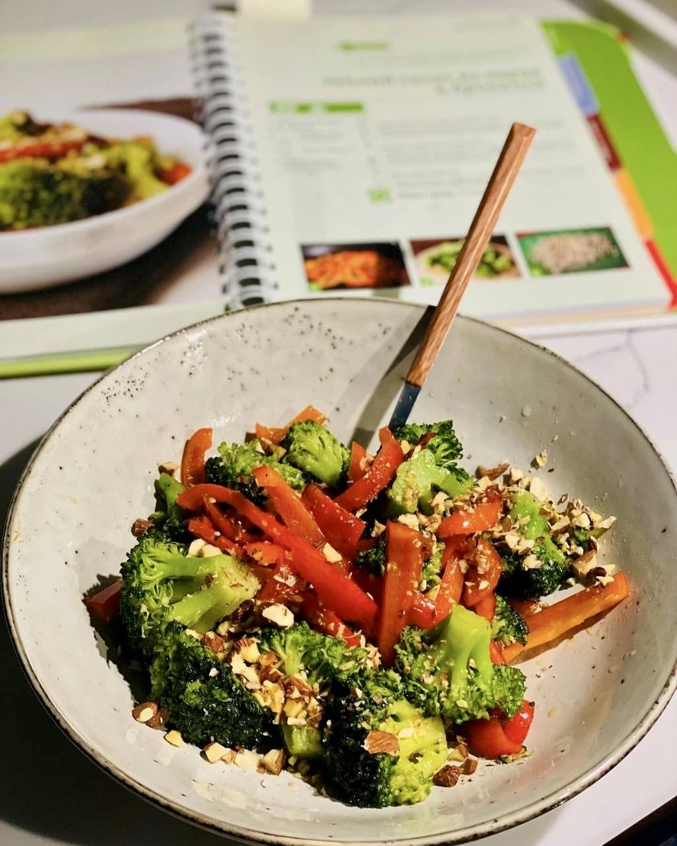 Ингредиенты: ▫️перец болгарский красный — 1 шт. ▫️брокколи замороженная — 200 г ▫️оливковое масло — 2 ст. л. ▫️вода — 50 мл ▫️лимонный сок — 1 ст. л. ▫️миндаль жареный — 1 горсть ▫️соль — по вкусу ▫️растительное масло — 2 ст. л. Способ приготовления: 1. Перец нарезать полосками и обжарить 5 минут на оливковом масле. Переложить в тарелку. 2. В этой же сковороде 3 минуты потушить брокколи, добавив воду. 3. После испарения жидкости добавить растительное масло и 3–4 минуты обжаривать брокколи до готовности. 4. В салатник выложить брокколи, перец, посыпать измельченным миндалем, добавить лимонный сок, соль. Все перемешать. Приятного аппетита!