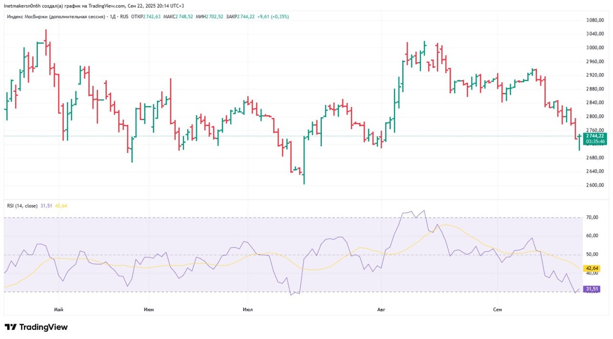 ❗️22 сентября российский фондовый рынок снизился, индекс МосБиржи подешевел на 0,25% до уровня 2741,06