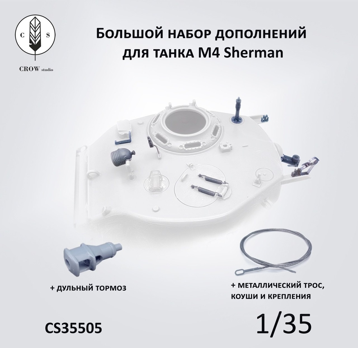 CROW Studio из Санкт-Петербурга выпустила на 3D-принтере набор деталей для моделей танков M4 Sherman в масштабе 1/35. В комплекте: -антенный ввод в двух положениях; -3 комплекта пружин люка; -крепления для пулемета "Браунинг" M2; -турельный фонарь; -дополнительный прицел командира; -дульный тормоз (также подходит на M18 Hellcat); -металлический буксирный трос; -коуши; -крепления троса; -буксировочный крюк