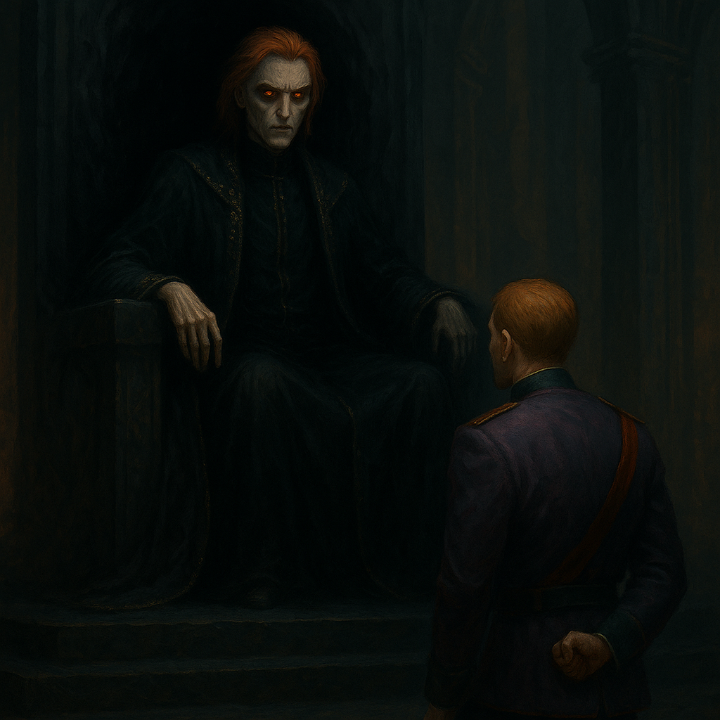 Глаза Владыки затянула чёрная пелена. Воздух вокруг сгустился, запахло гарью и сыростью подземелий. В зале воцарилась тишина - такая густая, что слышно было только медленное дыхание самого Владыки.