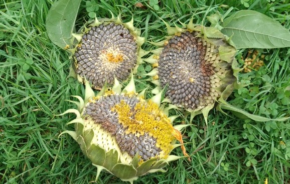 Убрала одну огородную культуру: птички начали выклевывать семена подсолнухов, поэтому сегодня срезала отцветшие корзинки, и спрятала. Мои домашние птички тоже любят поковыряться в подсолнухах, пока семена молочной спелости, даже галка Птя, так что пусть уж это лакомство останется для них. Вообще подсолнухи сажаю больше на срезку, для букетов, но самые крупные цветы оставляю своим птицам. Больше не буду сеять подсолнухи вдоль плетня - косить мешают, лучше посеять их где-нибудь отдельно, кучкой, и не на самом заметном месте. В вазе они прекрасны, а вот сад обезглавленные стебли совсем не украшают. На стеблях в междоузлиях часто завязываются бутоны, которые зацветут поздней осенью, поэтому жаль вырезать их под корень; даже сейчас пару таких стеблей оставила, хоть и собиралась убрать все полностью. А так подсолнухи отцвели уже - поникли и растрепались, дождь и ветер этому поспособствовали. Завтра очередь томатов - сорву последние пригодные плоды, порублю стебли, и укрою грядку новым слоем