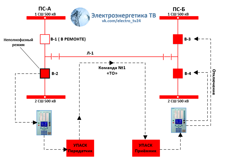 📌Если один из выключателей ВЛ отключён (в ремонте), а действием ЗНПФ на втором выключателе не устраняется его неполнофазное состояние, то при наличии тока нулевой последовательности защита от неполнофазного режима (ЗНР) действует с выдержкой времени на отключение трех фаз ВЛ, с запретом АПВ и пуском команды №1 «телеотключение (ТО)» по ВЧ каналам УПАСК. При получении команды №1 на другом конце линии приёмник УПАСК передаёт команду устройству РЗА (Основной и резервной защите данной линии), которое обеспечивает отключение выключателей со своей стороны.