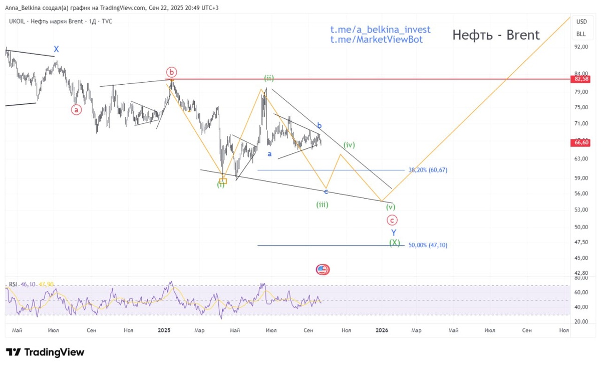 #Brent #DXY Нефть Завершили треугольник в волне b of (iii) of [c] of Y of (X). Полагаю, состоялся выход в волну с of (iii) of [c] of Y of (X). В воскресном обзоре рынков по нефти говорила о следующем: 🔹 Фундаментально, сохраняется давление со стороны ОПЕК+, который неожиданно принял решение об увеличении добычи в октябре. Саудовская Аравия стремится вернуть свою долю на мировом рынке. Т.о., рост добычи нефти вызвал опасения по поводу сохраняющегося ценового давления на нефтяных рынках. Картель наращивает добычу с апреля, несмотря на прогнозы о стабильном превышении предложения над спросом. 🔹 Нефть – это актив, номинированный в долларах. Снижение ставки ФРС привело к дальнейшему снижению курса доллара США по отношению к корзине иностранных валют. Снижение курса доллара обычно оказывает повышательное давление на цены на нефть, что может компенсировать рост добычи в рамках ОПЕК+. Однако – пока этого не происходит. Корреляции ломаются. Впрочем, доллар также мог завершить свою ус