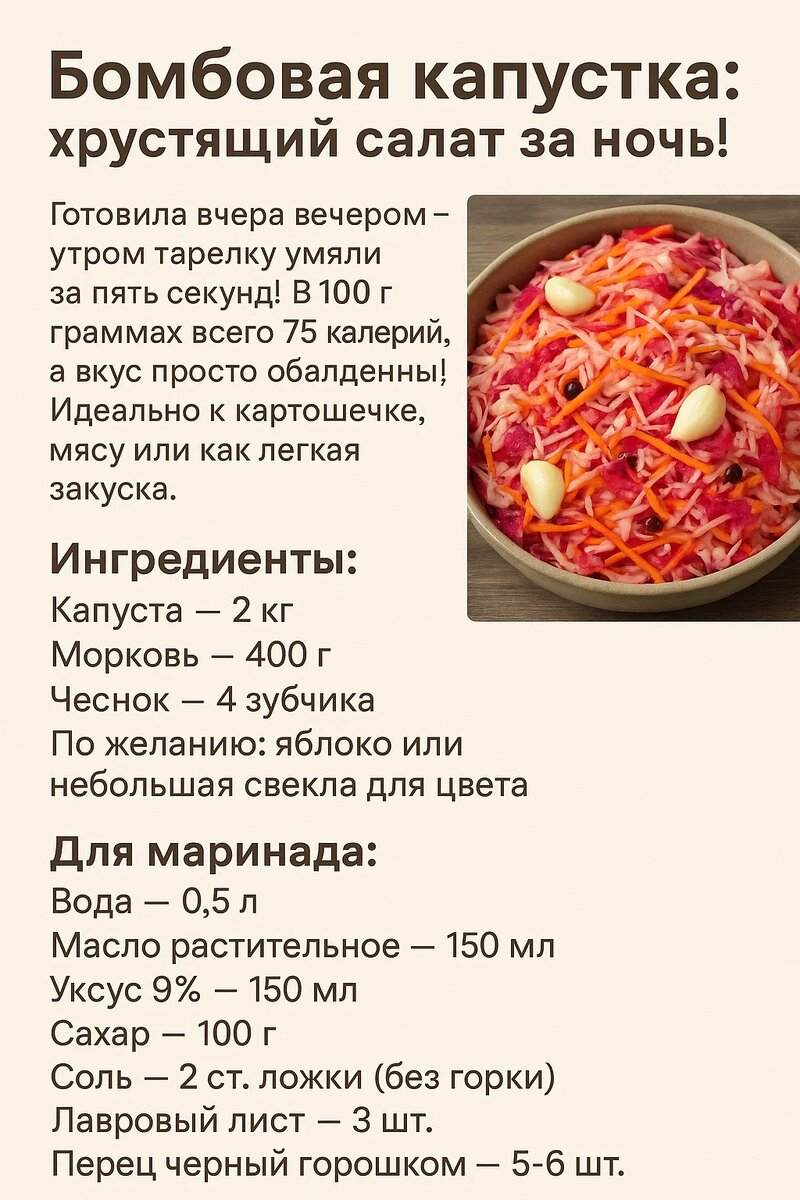 Готовила вчера вечером — утром тарелку умяли за пять секунд! В 100 граммах всего 75 калорий, а вкус просто обалденный! Идеально к картошечке, мясу или как легкая закуска. Ингредиенты: Для маринада: Приготовление: Секрет успеха: А вы любите такие быстрые закуски? Какой ваш фирменный рецепт маринованной капусты? Делитесь в комментариях! Подписывайтесь на канал — еще много простых и вкусных рецептов ждут вас! 😊