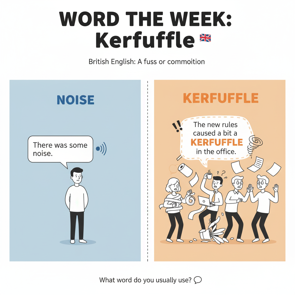 В английском есть много слов для описания шума и беспорядка: mess, chaos, commotion. Но если вы хотите звучать как истинный британец, попробуйте kerfuffle. Это забавное слово появилось в шотландском и ирландском диалектах и означает «переполох» или «суету», часто из-за пустяков. Сравните: Пример: Какое слово вы обычно используете, чтобы описать суматоху? #СловоДня #Kerfuffle #АнглийскийСловарь #УчимАнглийский #Суматоха #Vocabulary
