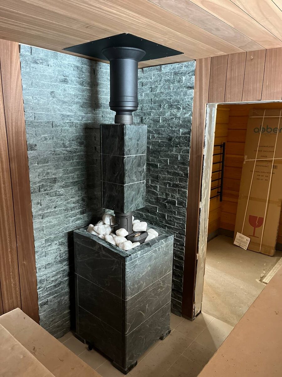 19.03.2025. Ленинградская область.КП Лесная Ривьера. Печь банная Прометалл Атмосфера L в облицовке Талькохлорит. Изолировали угол огнеупорными материалами👌. Приклеили натуральный камень👌. Установили печь👌. Собрали облицовку👌. Вывели дымоход в кровлю👌. Сделали гидроизоляцию кровли👌. Протопили печь, проверили работу и рассказали заказчику о правилах эксплуатации😊☺️👍. Всем добра❤️.