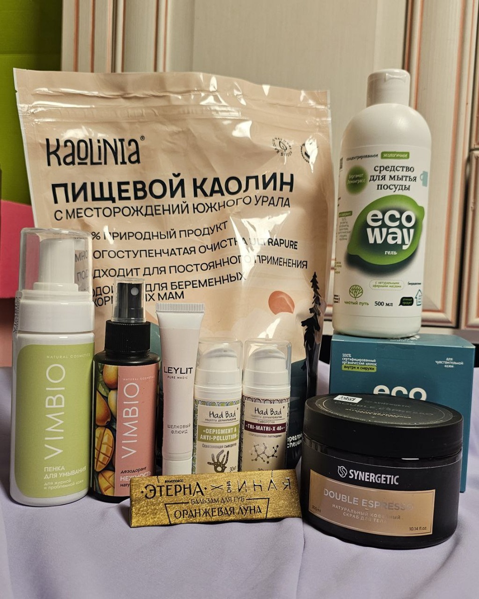 Шикарный улов с Eco Beauty Expo и да, я снова тот самый человек, который тащит домой целую сумку баночек и счастливее всех. Шуршу ими, как довольный шопоголик 1. Kaolinia мало мне было моей 10кг белой глины, взяла ещё про запас. Хотела ещё для ванн, но поняла, что просто не утащу 2. Vimbio пенка у них и правда отличная, поэтому забрала ещё. А заодно прихватила новинку: натуральный дезодорант с ароматом кокосика 3. Ecoway впервые вижу этот бренд. Удивилась, что у нас делают эко-средства для дома. Взяла жидкость для мытья посуды и прокладки, буду тестить 4. Dr.HadBad тоже новинка для меня. Осветляющая сыворотка от пигментации и пептидная сыворотка перекочевали ко мне 5. Leylit флюид для жирной кожи, специально взяла тревел-формат, для ближайшей поездки 6. Synergetic новый кофейный скрабик, буду отшелушивать бочка 7. Anvelian и ещё один новый российский бренд в копилочку. Решила начать знакомство с увлажняющей линейки: пенка, тоник и крем для лица 8. Eco Mirai церамидный крем для рук, то
