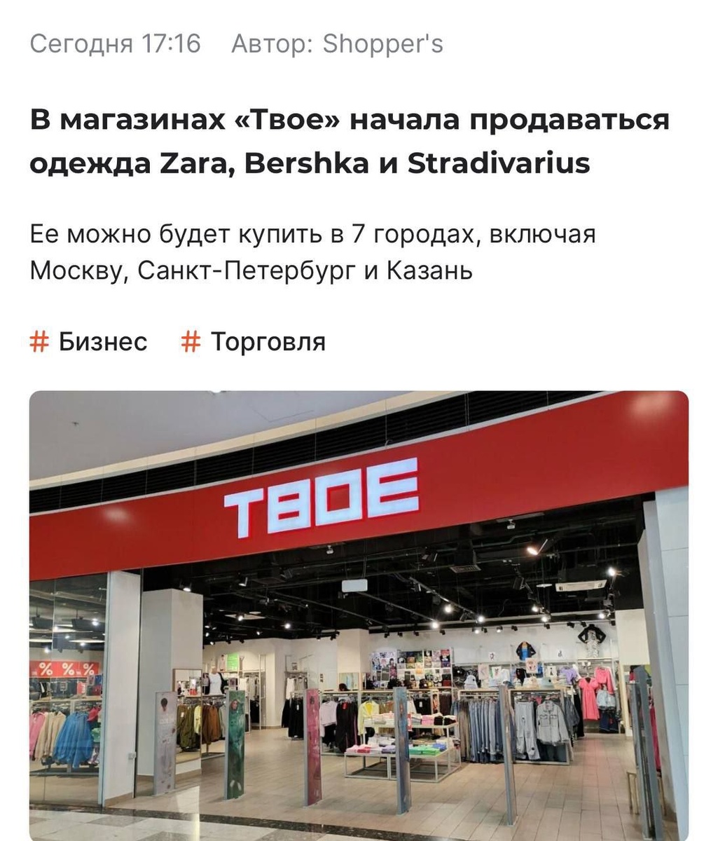 Zara, Bershka и некоторые другие бренды ВЕРНУЛИСЬ в Россию. Товары испанского Inditex group появились в магазинах ТВОЁ в Москве, Питере, Казани, Тольятти, Волгограде, Нижнем Новгороде и Краснодаре.