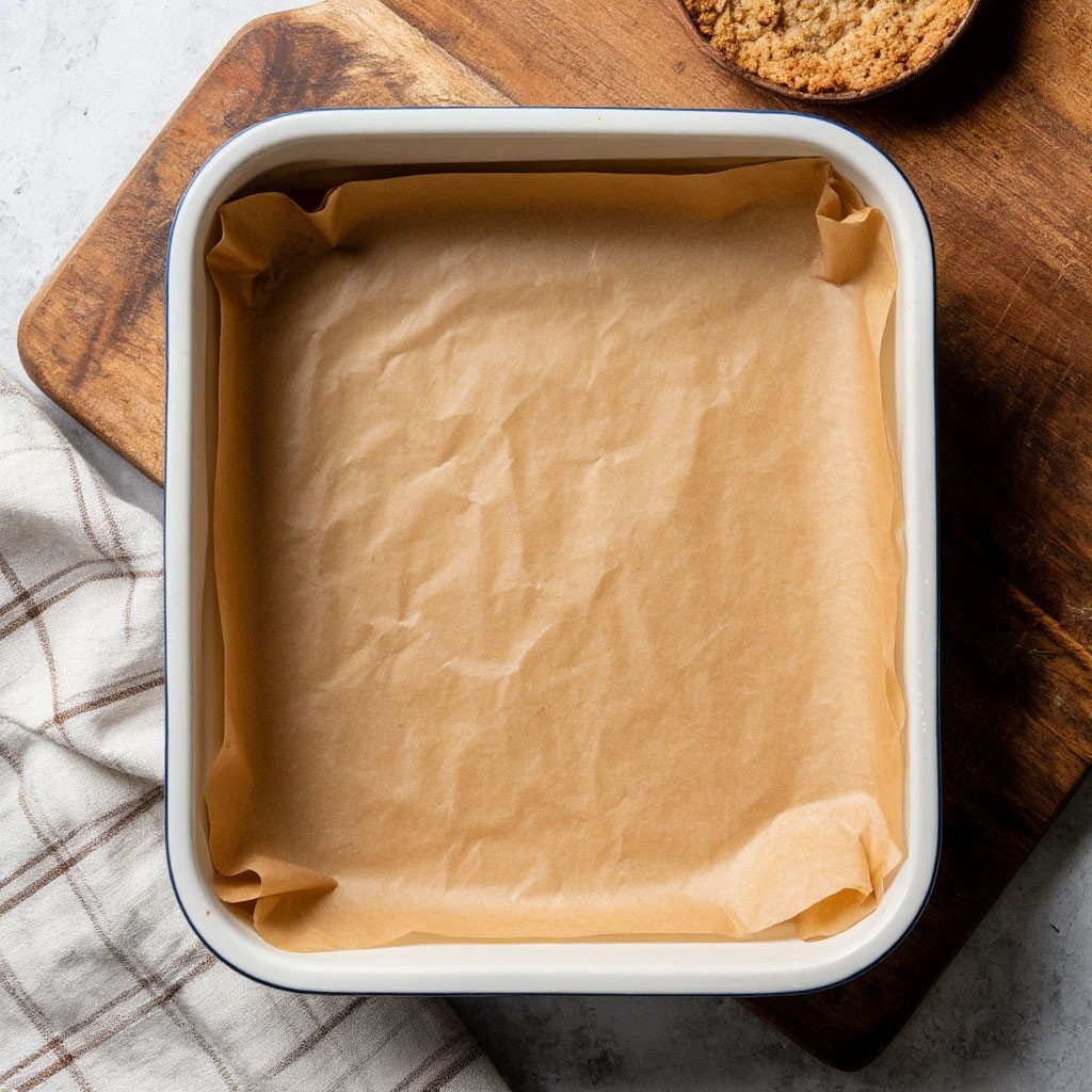 Разогрейте духовку до 175°C. Застелите квадратную форму для выпечки (примерно 20х20 см) пергаментной бумагой, оставив свисающие края для удобного извлечения блонди.