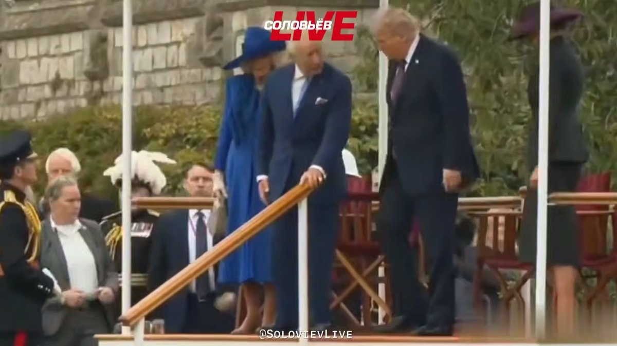 Во время визита в Великобританию президент США Дональд Трамп нарушил правила королевского протокола. Как сообщает телеграм-канал «Соловьёв», американский лидер позволил себе фамильярное прикосновение, похлопав британского монарха Чарльза III по спине. «Согласно этикету, подобные действия недопустимы — инициатива физического контакта может исходить только от самого короля. Кроме того, Трамп вскоре и вовсе оставил монарха, переключив внимание на беседу с гвардейцем», – пишет телеграм-канал «Соловьёв». Фото: телеграм-канал «Соловьёв».