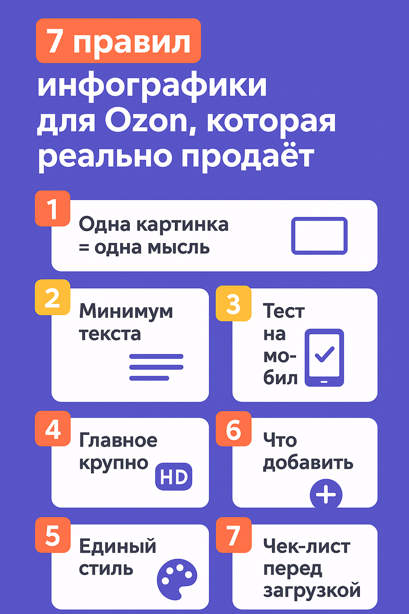 На маркетплейсе у вас есть всего несколько секунд, чтобы зацепить покупателя. Он не читает длинные описания — он листает фото. И именно инфографика решает, будет ли товар кликнут и добавлен в корзину или проскроллен мимо. Инфографика — это не декор, а инструмент продаж. Она: Инфографика — это ваш главный «немой продавец». Она напрямую влияет на CTR, конверсию, отзывы и рекламные расходы. Запомните главное правило: одна картинка = одна выгода.