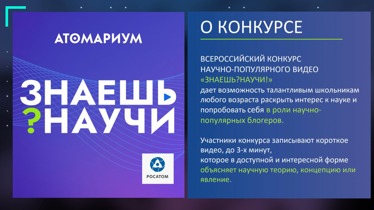 Что ж, давайте более подробно рассмотрим программное положение конкурса видеоработ «Знаешь? Научи!» от компании «Росатом» для возможного участия ребят, научных-исследователей, в следующем 2025/2026 учебном году. «Знаешь? Научи!» – всероссийский конкурс научно-популярного видео, в котором каждый может раскрыть свой талант, интерес к науке и попробовать себя в роли блогера или даже учителя. Это отличный опыт, который обязательно понадобится в будущем каждому человеку! Список тем номинаций всероссийского конкурса научно-популярного видео «Знаешь? Научи!» 2025 года, в котором могли поучаствовать школьники начальных, средних и старших классов: «Электродвижение», «Авиация будущего», «Космос», «Полимеры» и номинация медицинской направленности «Дыхание – жизнь».