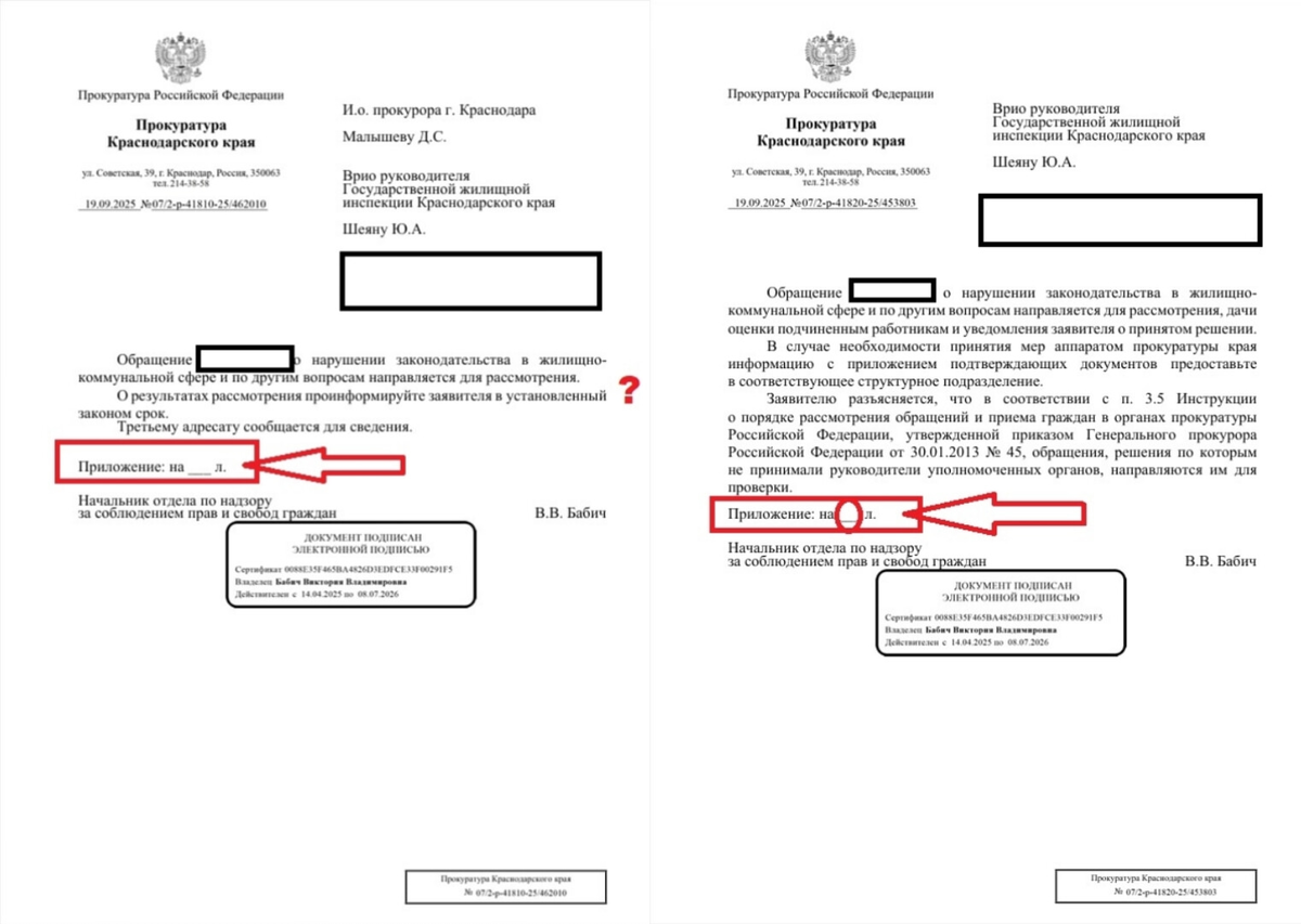 22 сентября 2025 года мною получены очередные ответы от начальника отдела прокуратуры Краснодарского края Бабич В.В.: