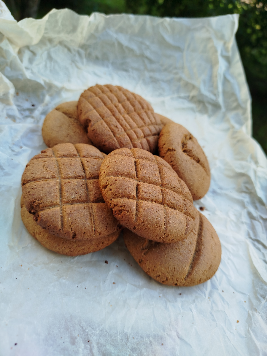Ржаные коржики «как у бабушки» • Ржаная мука - 1 стакан (~ 130 г) • Яйцо - 1 шт. • Сливочное масло размягченное - 45 г • Соль - щепотка • Мед - 50 г • Молоко - 2 ст.л. (20 г) • Разрыхлитель - 1 ч.л. В миске взбить яйцо, туда же щепотку соли, растопленное сливочное масло, мёд и молоко. Все перемешать. Добавить стакан муки и разрыхлитель. Тесто собрать рукой, долго замешивать не нужно. Оно должно быть липкое, и консистенция как мягкий пластилин. Убрать его в пакет и оставить в холодильнике на 30 мин. Затем достать из холодильника ,раскатать в колбаску и поделить на 8 частей. Из каждой части скатать шарик, и придавить его шпателем кондитерским. Толщина коржика примерно 1 см.Можно сделать рисунки помощью обратной стороны ножа. Поставить В разогретую на 180 градусов духовку на 15 минут.