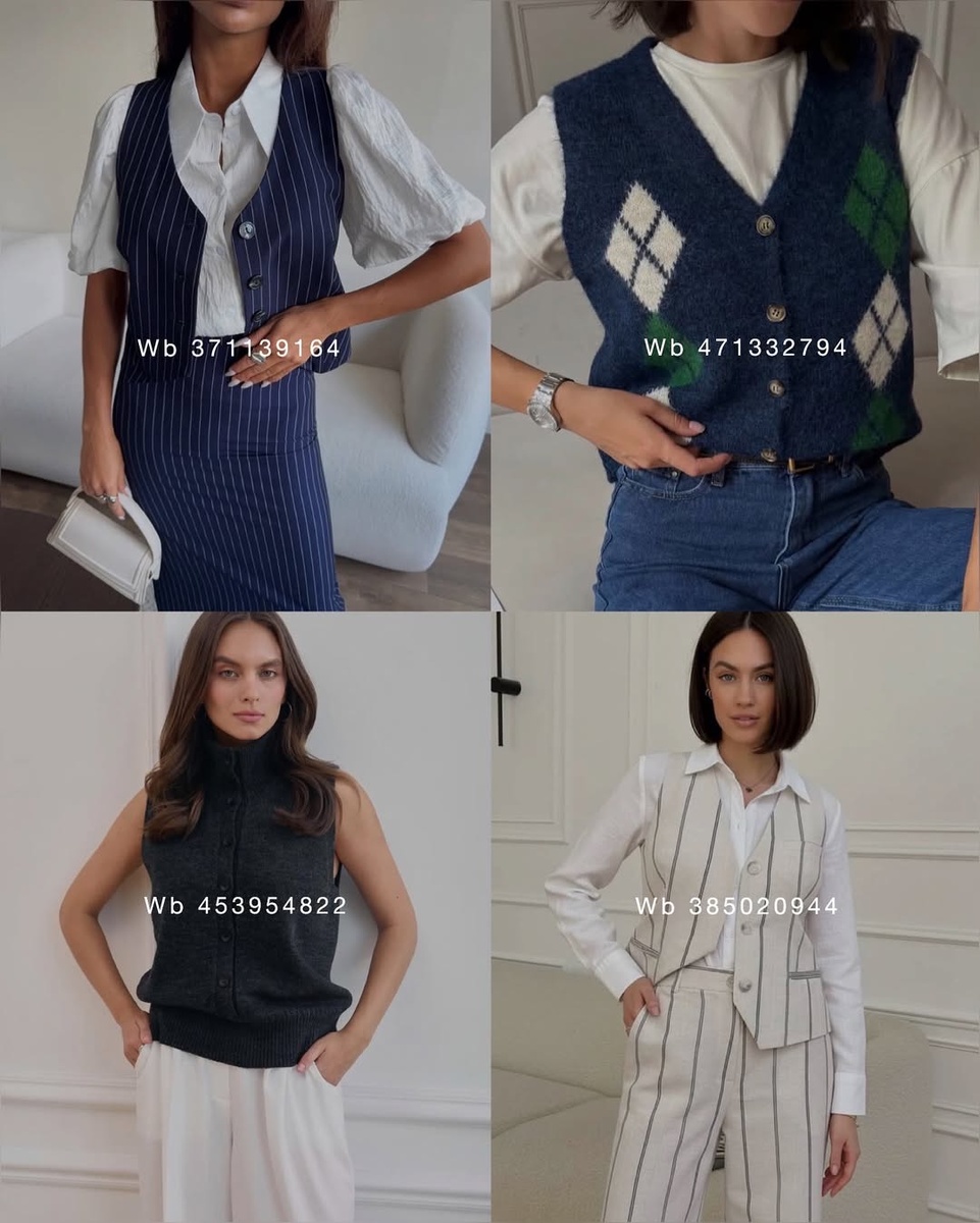 Эти восемь вещей с WB — не просто «красивые кадры», а полноценная мини-капсула. Здесь есть база (лонгслив 448975057), акценты (аргайл 471332794, корсет 485324649, юбка 305063995) и архитектура силуэта (жилеты 371139164 и 385020944, жакет 518128709, трикотаж 453954822). Меняйте роли, пробуйте контраст фактур и держите баланс пропорций — и ваш гардероб начнёт работать как хорошо собранный интерьер: чистые линии, правильный свет и несколько эффектных деталей, которые делают всё.