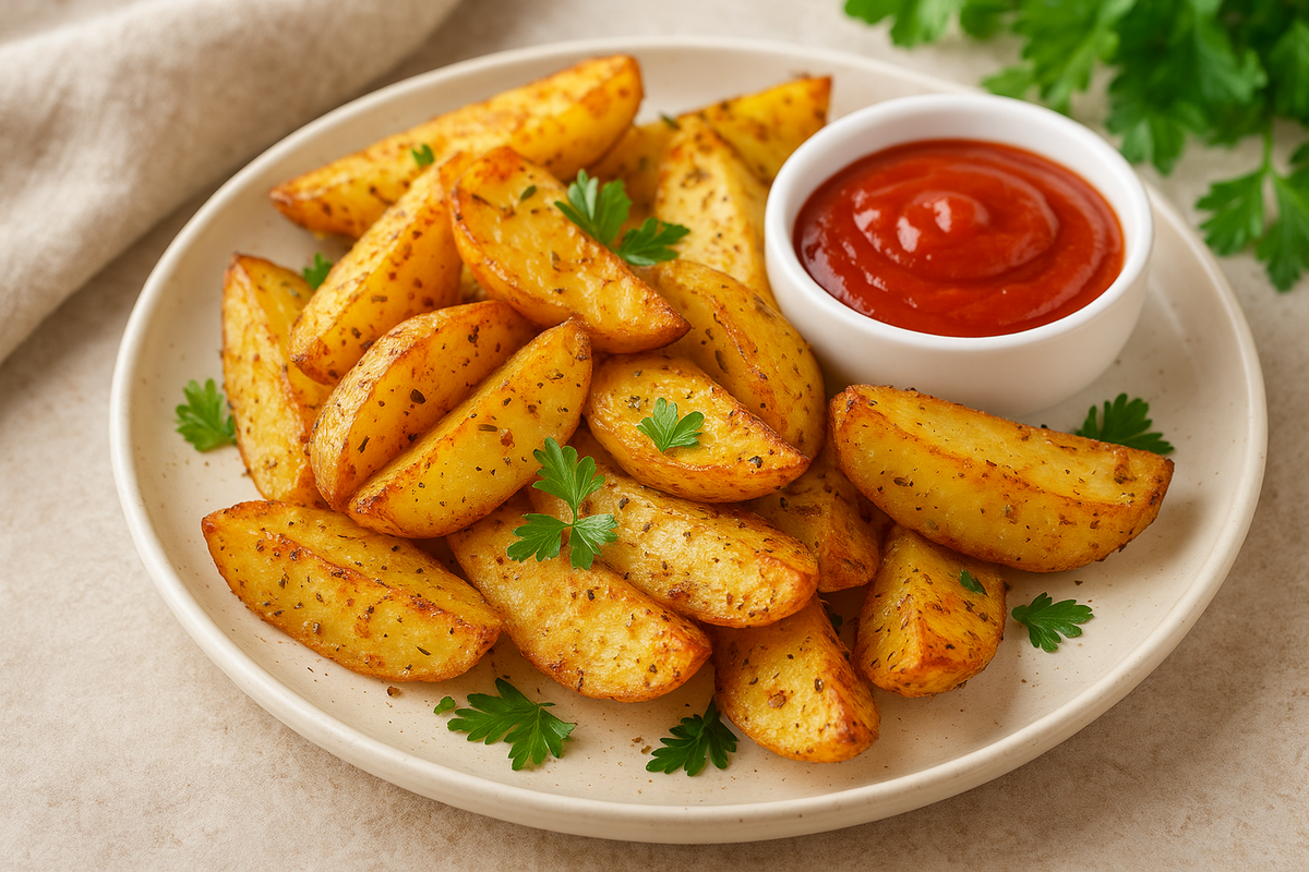 Картошка по-деревенски — это тот самый гарнир, который любят и взрослые, и дети. Ароматная, золотистая, с хрустящей корочкой и мягкой серединкой — она идеально подходит к мясу, рыбе или как самостоятельное блюдо с соусом. И самое приятное — готовится легко и без лишних хлопот. 🛒 Ингредиенты 👩🍳 Пошаговый рецепт 1. Подготовка картофеля. Картофель хорошо вымойте (можно не чистить, кожура даёт ту самую «деревенскую» текстуру). Разрежьте каждый клубень на дольки. 2. Приправы. Смешайте в глубокой миске масло, соль, перец, паприку и измельчённый чеснок. Добавьте сухие травы. 3. Маринование. Обваляйте картофельные дольки в смеси специй и масла. Дайте постоять 10–15 минут — так вкус станет ярче. 4. Выпекание. Выложите дольки на противень, застеленный пергаментом. Запекайте при 200 °C 35–40 минут, периодически переворачивая, чтобы картошка подрумянилась со всех сторон. 5. Подача. Подавайте горячей, посыпав свежей зеленью. Отлично сочетается с кетчупом, сметаной или чесночным соусом.
