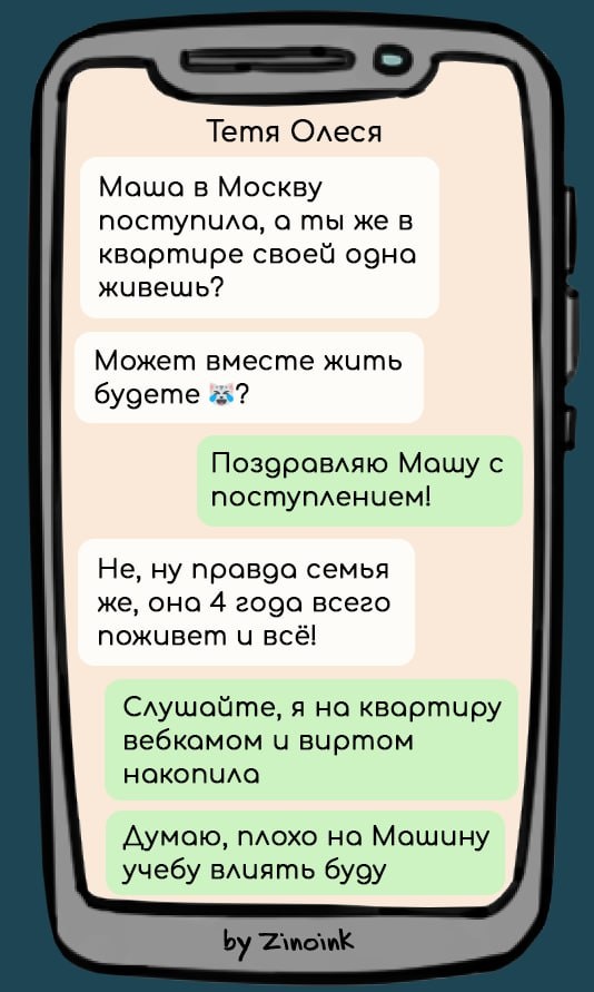 Всем известно выражение, что родственников не выбирают. Зато они всегда выбирают не самое лучшее место и время, чтобы напомнить о себе!) Сегодня я собрал 7 смешных переписок, в которых родственники пытаются манипулировать чувствами. Уверен, они тебе понравятся! Хихикай с удовольствием и не забывай, что ещё больше классных шуток без цензуры и рекламы – ты найдешь с подпиской премиум. Как только кто-то из семьи выбивается в люди – тут же сразу образуется куча родственников, которая тоже хочет пожить на широкую ногу! Правда им нужно понимать, что и здесь придется кое-чем жертвовать. Для любой матери сын – остаётся любимым сыночкой-корзиночкой в любом возрасте! А вот невестка – всегда змеюка подколодная. О том, как общаться с такими свекровями – расскажем в следующей переписке. Существует стереотип, что бати – довольно примитивные в выражении чувств люди. Но это не совсем так! За что-то они все же переживают всей душой. Говорят, муж – это голова, а жена – шея. Но иногда эта шея так пилит,