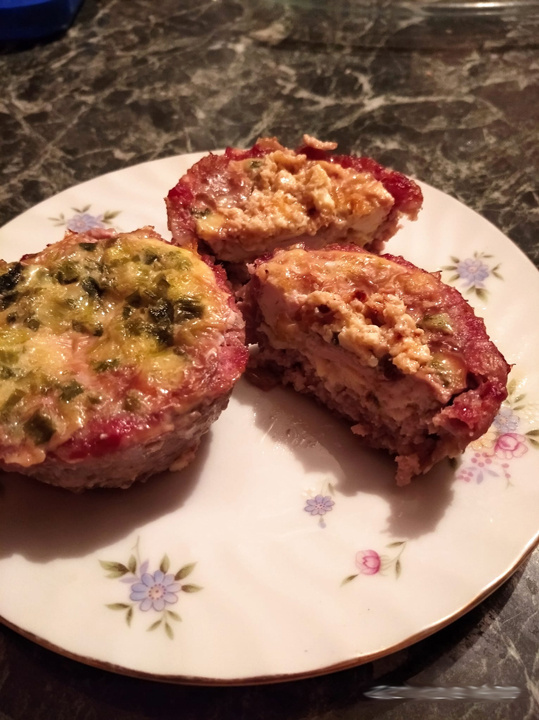 Из фарша (свинина и говядина, лук) в формочках для кексов сделала корзинки.