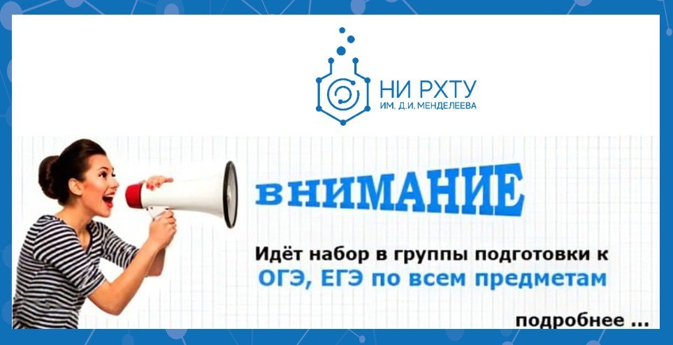 Центр повышения квалификации руководящих работников и специалистов НИ РХТУ им. Д.И. Менделеева Приглашаем на подготовительные курсы по МАТЕМАТИКЕ, РУССКОМУ ЯЗЫКУ, ХИМИИ, ФИЗИКЕ, ИНФОРМАТИКЕ, ОБЩЕСТВОЗНАНИЮ для учащихся 9, 10, 11 классов Длительность обучения - с 01.10.2025г. по 31.05.2026г. Начало занятий - 1 октября 2025г. Занятия проводятся 1 раз в неделю Количество слушателей в группе ограничено до 15 человек 1 занятие 3 академических часа (стоимость - 900 рублей) Подробная информация и запись на курсы: 8(906) 625-18-47 Руководитель ЦПКРРиС - Воронина Татьяна Сергеевна 8(48762) 4-89-91, 8 (960) 610-09-35 Заключение договоров - Климанова Елизавета Сергеевна г. Новомосковск, ул. Дружбы, д.8, каб. 415 e-mail: ni.rhtu@mail.ru #НИРХТУ #ПоступайПРАВИЛЬНО