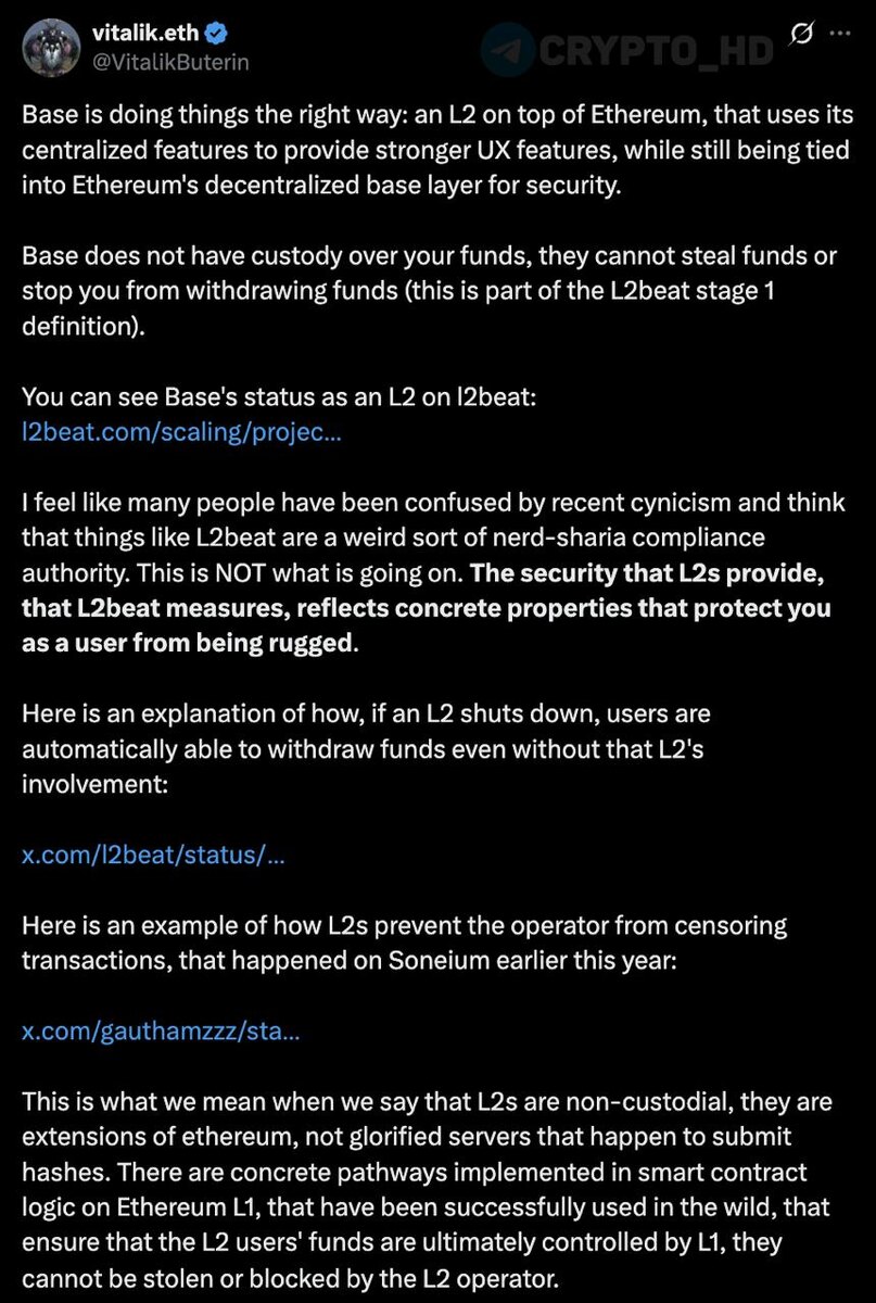 🤌 Виталик Бутерин: Base – пример «правильного» Layer 2 блокчейна. ➤ Он работает поверх Ethereum, сочетая удобство централизованных механизмов с безопасностью, которую обеспечивает децентрализованный L1. ➤ Base не хранит ваши средства и не может их украсть или заморозить (подтверждено на L2beat). ➤ Даже если L2 внезапно отключится, смарт-контракты Ethereum позволяют пользователям самостоятельно вывести активы. Ранее: - Виталик Бутерин и AI - защита децентрализации - двойные стандарты Crypto Headlines