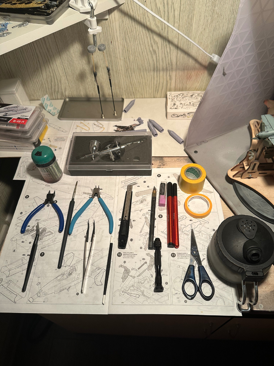 Всем привет! В своей очередной статья опишу инструменты, которыми пользуюсь лично. Надеюсь это поможет начинающим моделистам. Первое и основное - колющие и режущие)) Я использую канцелярский нож от Тамии, но можно с успехом пользоваться каким либо другим, лезвия беру на маркетплэйсах. Также для каких либо тонких работ я использую модельный нож от той же Тамии. Ему уже лет двадцать, сменным лезвиям тоже) Второе - для отделения деталей от литников использую бокорезы с озона, какие то японские. Проблем нет. Переплачивать за какой нибудь Диспае не стоит в данном случае. Также рядом с синими бокорезами на фото выше лежат голубые. Они нужны для работы с фототравлением, для загиба и придания различных форм тонкому металлу. Третье - пинцеты. Их у меня очень много и отличаются они в основном формой и характером применения. Например пинцет от Диспае используется только для работы с декалями. Четвертое - скрайбер. Их у меня два, от Тамии и от Диспае. Нужны для нарезания расшивки. Нужная вещь! От
