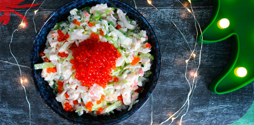 огурцы — соломкой или небольшими кусочками. Смешиваем всё с майонезом и слегка присаливаем. Украшаем красной икрой. Источник: https://wildcrab.ru/news?id=2857