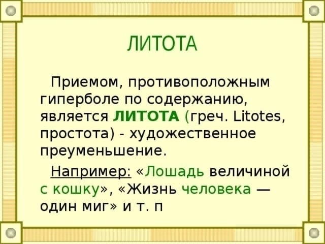 маковой росинки во рту не было. Примеры литоты в художественной литературе: И, шествуя важно, в спокойствии чинном.