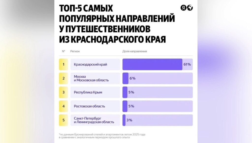 Аналитики сервиса «Яндекс Путешествия» провели исследование минувшего туристического сезона. О результатах анализа сервис сообщил «Краснодарским известиям». Краснодарский край оказался в числе самых популярных направлений среди россиян летом 2025 года. А сами жители Кубани чаще всего выбирали отдых в пределах региона. По данным сервиса, на долю отелей края пришлось 61% всех бронирований у жителей Кубани. Далее в рейтинге самых популярных направлений идет Москва и область, Крым, Ростовская область и Санкт-Петербург. Всего 96% бронирований пришлись на поездки внутри страны. Кроме того, вырос интерес к малым городам — бронирований туда стало больше на 84%. Среди самых популярных направлений — Судак, Алушта и Горячий Ключ.