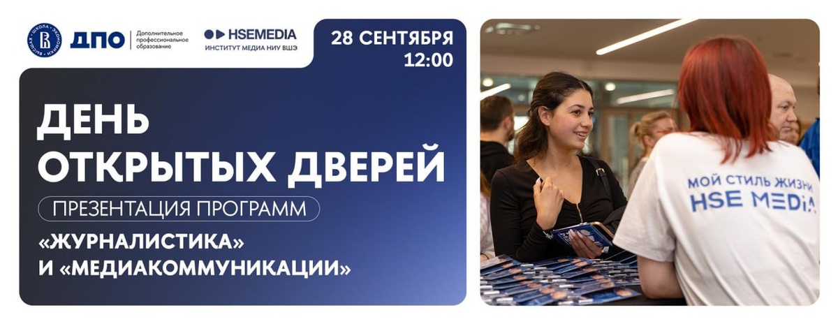 ☀️Здравствуйте! 🔥Приглашаем вас на первый в этом учебном году День открытых дверей программ «Журналистика» и «Медиакоммуникации» Института медиа НИУ ВШЭ. 🫶Это возможность получить максимум информации о поступлении и из первых рук узнать о том, как строится обучение и карьера в медиа. В программе мероприятия: 💠Честный разговор о поступлении: как выбрать траекторию, правильно подготовиться к творческим испытаниям и получить дополнительные баллы. 💠Презентации программ от академических и творческих руководителей: вы узнаете, чему реально учат на программах и как эти знания применяются в профессии. 💠Карьерные истории: где работают наши выпускники и какие возможности есть у студентов уже с первого курса. 💠Живой опыт: вы сможете попробовать себя в роли ведущего в нашей настоящей выездной телестудии. 💠Личные встречи с преподавателями и студентами — получите ответы на все свои вопросы из первых уст. 🎁 Подарки и розыгрыш фирменного мерча от HSEMEDIA. 🗓 Мероприятие состоится 28 сентя