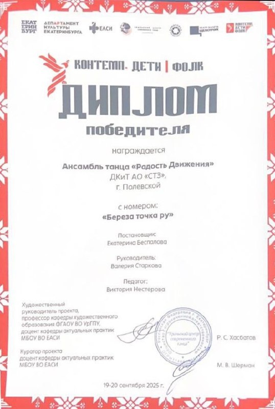 🌟Когда движение в радость!🌟 🔔20 сентября Ансамбль танца «Радость движения» ДКиТ АО «СТЗ» (рук. Валерия Алексеевна Старкова) в составе старшей группы по личному приглашению профессора кафедры художественного образования Института искусств УрГПУ Рената Саримовича Хасбатова представлял город Полевской в XI Всероссийском проекте «Контемп.Дети.Фолк», который проходил в МАУК «Детский театр балета «Щелкунчик» в городе Екатеринбурге. Коллектив выступил с уникальным номером «Береза точка ру», впечатлившим всех своей красотой и мастерством.💃 👍Ребята успешно прошли отбор среди сильнейших коллективов Свердловской области, по итогам жюри было отобрано всего 14 танцевальных коллективов, среди которых блестяще показал себя ансамбль «Радость движения».💪 ✨Это событие подчеркивает высокий уровень мастерства участников и профессионализм педагога, ведь ребята продемонстрировали великолепную технику исполнения и выразительность💫