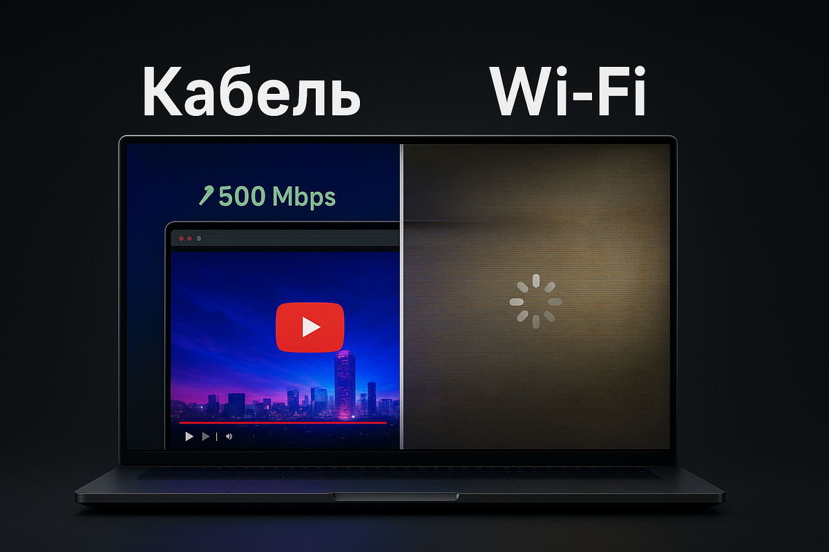 Вы когда-нибудь замечали, что интернет словно имеет два лица? Днём по кабелю всё летает: фильмы скачиваются быстрее, чем успеваешь поставить чайник, игры обновляются за минуты, а видеозвонки идут гладко. Но стоит перейти на Wi-Fi и картина меняется. Стрим начинает "подкашливать", файлы тянутся как жвачка, а обещанный провайдером "гигабит" куда-то испаряется. Я тоже долго думал, что проблема в тарифе или жадности провайдера, пока не разобрался. Проводной интернет похож на скоростное шоссе, где нет пробок. Сигнал идёт напрямую: от роутера к вашему устройству, без препятствий. Поэтому, если у вас стоит тариф на 500 или 1000 Мбит/с, именно такие цифры вы и увидите в тесте скорости. Всё честно и стабильно. Теперь представьте оживлённый рынок, где каждый кричит громче другого. Вот так работает Wi-Fi. Сигнал летит по воздуху, сталкивается со стенами, мебелью, микроволновкой и десятками соседских роутеров. В итоге ваши мегабиты теряются в этом шуме. На расстоянии нескольких метров от роутера с