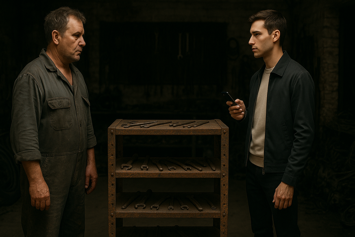 Выпили. Потом Николай достал фотографию — старую, чёрно-белую. Его отец в молодости, в этом же гараже, с гаечным ключом в руках.