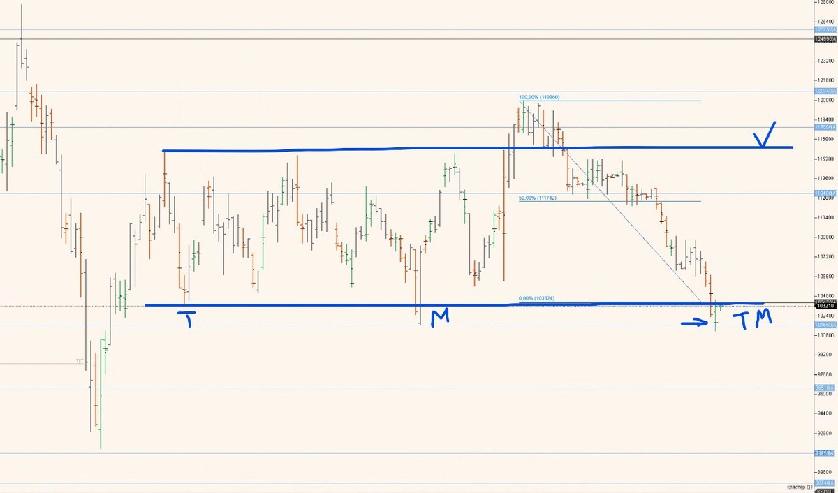 🔥 График Ри — ТФ 1 день (глобальный взгляд) 📊 Локально я писал вчера, а если смотреть глобально, то хорошо просматривается уровень с построением диапазона. 📈 По классике у нас есть: тест уровня (Т), манипуляция (М), тест манипуляции (ТМ). Далее может быть вторая манипуляция и её тест. А если уж и она не устоит — тогда пробой и продолжение снижения. ⚡ Однако вероятность отработки сформированного диапазона всё же в данный момент выше. Это не означает вертикальный взлёт до верхней границы: по пути этого движения (если оно состоится) есть ряд усилий продаж. Хоть они и были на прошлом контракте, их всё равно необходимо иметь в виду. 📌 Обращаю внимание на незакрытый кластер — рынок его закроет, и возможно, это будет хорошей точкой для присоединения к росту (хотелось бы, чтобы он всё же состоялся). Не ИИР