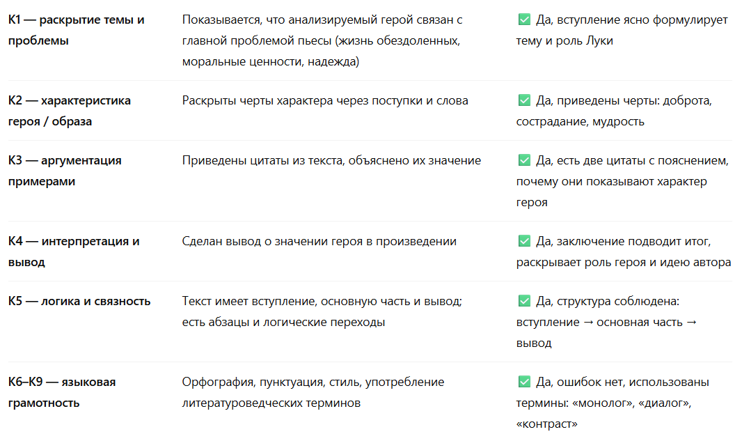 Пример задания Прочитайте отрывок из пьесы М. Горького «На дне». Проанализируйте образ Лука, героя пьесы. Какие черты характера раскрываются через его поступки и слова? Приведите цитаты и объясните их значение. Пьеса М. Горького «На дне» раскрывает жизнь обездоленных людей и их внутренние противоречия. Одним из ключевых персонажей является Лука — мудрый и сострадательный человек. В этом анализе я рассмотрю его характер, поступки и слова, которые показывают его роль в пьесе. Таким образом, Лука в пьесе «На дне» символизирует надежду, сострадание и моральный ориентир для людей, оказавшихся на жизненном «дне». Через его образ автор показывает, что даже в тяжелых условиях доброта и поддержка способны изменить внутренний мир человека. Давай проверим по критериям ФИПИ, чтобы точно понимать, что этот анализ соответствует требованиям ЕГЭ по литературе. Вывод