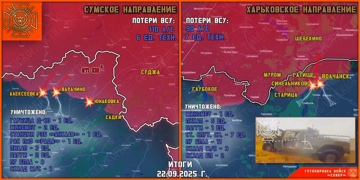 К утру 23 сентября группировка войск «Север» рассказала о боях в Харьковской и Сумской областях, в том числе на подступах к границе с Курской областью. На правом фланге наступления российская авиация, расчеты БПЛА и артиллерия работают в интенсивном режиме. Морпехи Северян продвинулись в районе Варачино. В 125 отмбр ВСУ назревает бунт. Военнослужащие ремонтного батальона грозят массово покинуть воинскую часть из-за решения командования перевести их в штурмовики. На Теткинском и Глушковском направлениях перемен не наблюдается. Силы Северян выбивают скопления живой силы и техники противника.