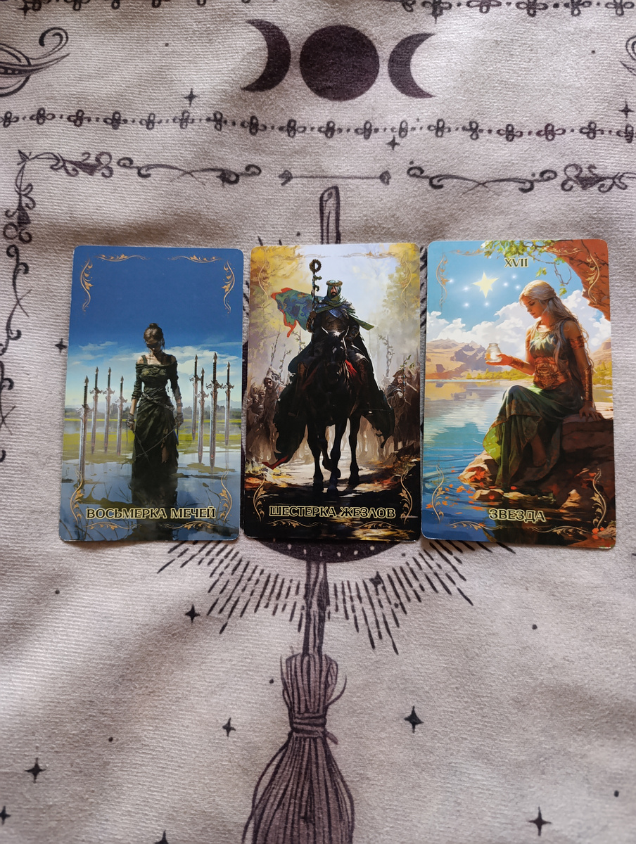 1. 8 Мечей — Сейчас или в самом начале периода ты можешь чувствовать себя ограниченным, запутанным или даже в ловушке собственных мыслей. Возможно, есть страхи или сомнения, которые мешают двигаться вперёд. Но важно помнить — эти ограничения часто больше в голове, чем в реальности. 2. 6 Жезлов — После периода сомнений придёт время победы и признания. Эта карта говорит о успешном исходе, о том, что ты сможешь преодолеть препятствия и заслуженно получить поддержку или благодарность окружающих. Твоя самооценка растёт, и это заметят другие. 3. Звезда — Финал расклада — светлая и вдохновляющая карта. Она обещает надежду, внутреннее исцеление и новые возможности. После победы тебя ждёт период восстановления и обновления, появится чувство веры в себя и будущее. Итог: в ближайшее время ты пройдёшь через внутренние ограничения и сомнения (8 Мечей), но затем сможешь одержать важную победу и получить признание (6 Жезлов), что приведёт к вдохновению и новому жизненному этапу с надеждой и ясно