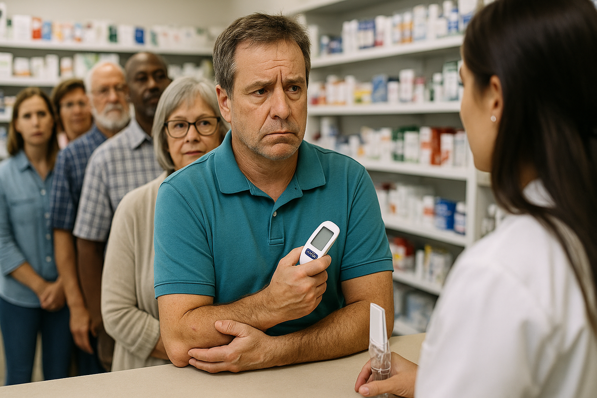 Фармацевт листает каталоги, звонит «на склад» — где-то в небесной канцелярии полосок. Параллельно рассказывает про акции на витамины, как будто витаминами можно измерять сахар.