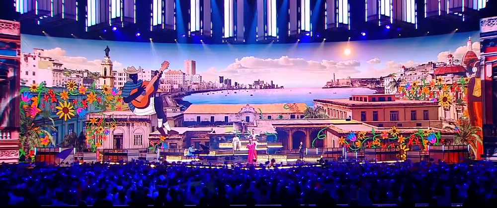 Второй мой специальный приз назывался бы "Сценическое оформление", и его получила бы команда Кубы, во главе которой выступила певица Сулема Иглесиас Саласар, она же автор текста к конкурсной песне. Посмотрите, какие роскошные красочные декорации, ещё и анимированные. Их хотелось разглядывать в деталях. Да и петь на таком занимательном фоне, мне кажется, намного веселее. Что певица и продемонстрировала.