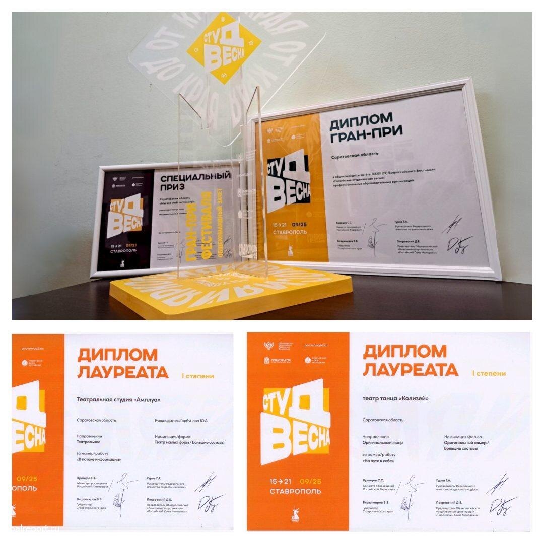 С 15 по 21 сентября в г. Ставрополь состоялся XXXIII (IV) Всероссийский фестиваль «Российская студенческая весна» профессиональных образовательных организаций. Участниками фестиваля стали 2 000 студентов из 70 регионов России. Творческие коллективы Губернаторского колледжа ТЕАТР ТАНЦА «КОЛИЗЕЙ» и ТЕАТРАЛЬНАЯ СТУДИЯ «АМПЛУА» под руководством Горбуновой Юлии Александровны стали ПОБЕДИТЕЛЯМИ в театральном направлении и оригинальном жанре. Региональная программа Саратовской области получила специальный приз за «Актуальность темы». В 2025 году фестиваль проходит в рамках Года защитника Отечества. Конкурсная программа фестиваля прошла в период с 16 по 19 сентября и включала в себя 10 направлений: «Региональная программа», «Вокальное», «Инструментальное», «Танцевальное», «Театральное», «Оригинальный жанр», «Мода», «Медиа», «Видео», «Арт». 20 сентября в Ставрополе на Площади Ленина состоялась торжественная Церемония закрытия, на которой были названы победители фестиваля. По итогам общекомандно