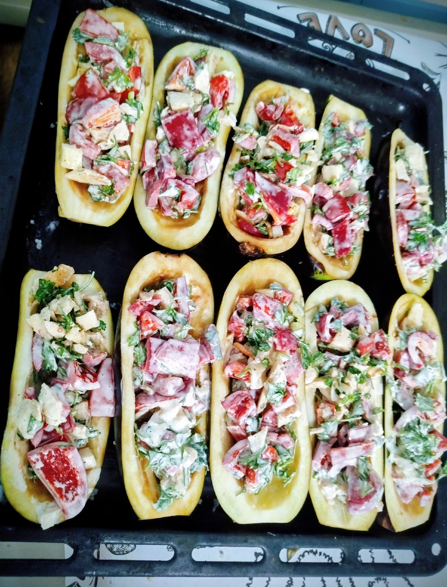 Пока сезон, и овощи относительно недорогие, а у многих свои из огорода, ловим момент. Сегодня готовим лодочки из баклажанов с овощной начинкой. Начинки можно варьировать. Можно и мясную начинку сделать. Я остановилась на овощной. На мой противень влезли 5 небольших баклажанов, то есть 10 половинок. Начинка: 4 небольших помидора 3 болгарских перца Внутренности 3-4 половинок (или грибы) Петрушка пучок Соль, приправы Сметана или майонез Сыр 50г "Баклажаны разрезать на половинки. Чайной ложкой удалить сердцевину и чуть смазать лодочки солью, чтобы были мягче. Для начинки болгарский перец, грибы, помидоры без мякоти, зелень мелко порезать, смешать со сметаной. Начинить лодочки. Выпекать в духовке при 180 °С 30 минут. Минут за 10 до готовности посыпать сыром. Дополнение автора: баклажаны лучше брать не сильно крупные." Для пикантности можно и чеснок выдавить в начинку. 😁 Очень вкусные интересные лодочки получаются 🚤⛵ Не ковыряю, а ем , откусывая от всей лодочки, держа её в руке. Так пр